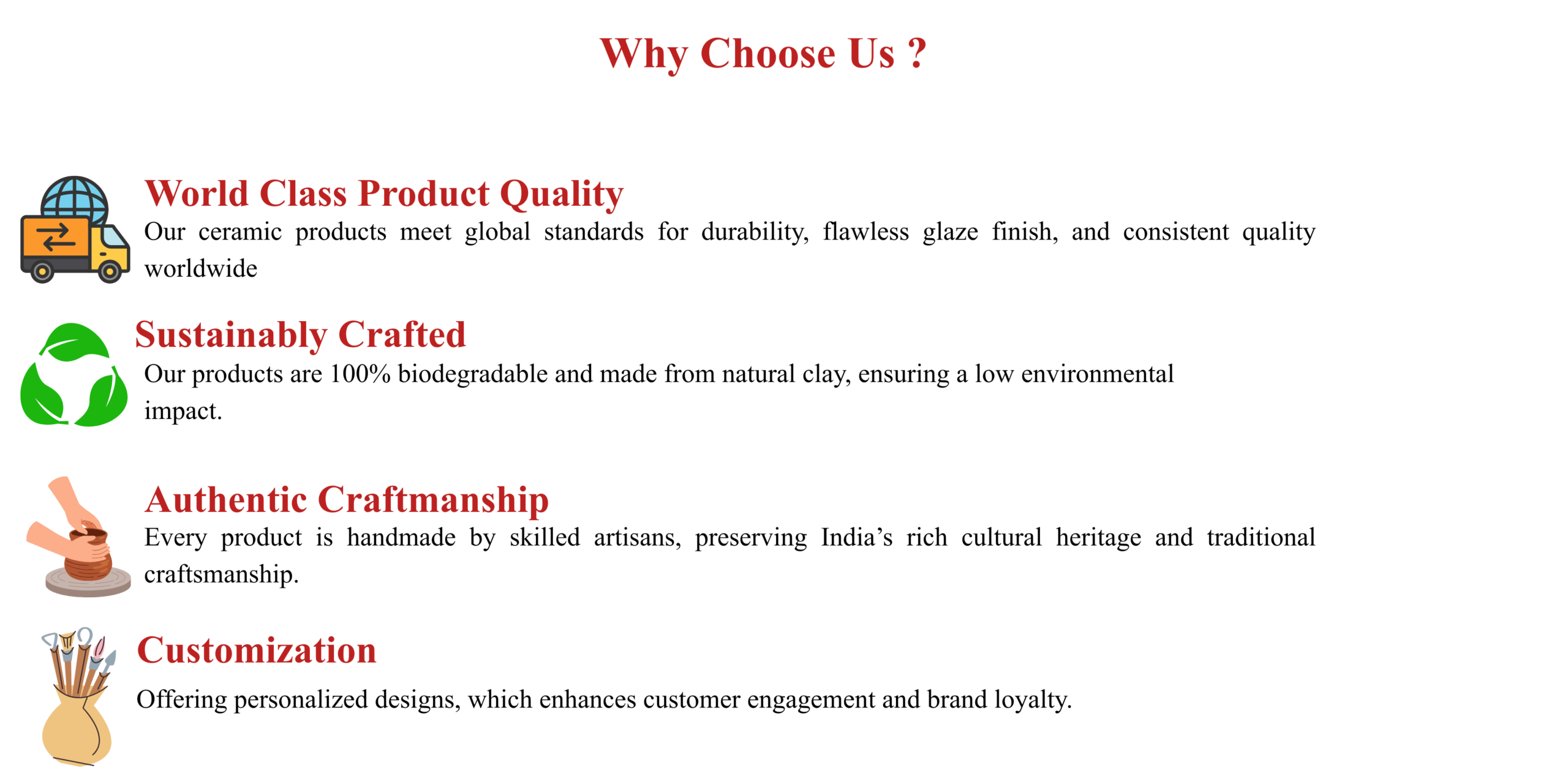 At Dynamic Handicraft Creations, our journey begins in the heart of India where clay meets culture and hands of humble artisans transform earth into timeless beauty. Yet in today’s rapidly modernising world, there extraordinary craft often remains unseen and undervalued.We exist to change this narrative.As an export driven company, Dynamic Handicraft Creations takes pride in bringing India’s finest eco-friendly earthenware across the globe. Each creation is more than a product, it is a symbol of craftmanship, patience and cultural continuity.